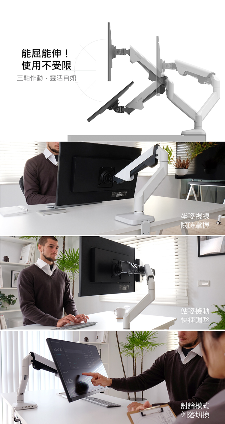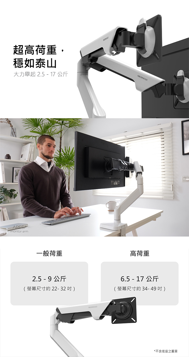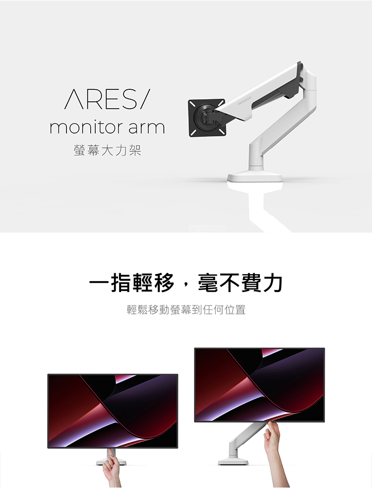 MODERNSOLID 結合多年大廠代工經驗,推出【 Ares 大力架 】,搭載獨家「靜態平衡」技術,提供比大廠更高標準的螢幕支架,價格更親民。一指輕觸,輕鬆滑動螢幕;穩固懸浮,絕不垂落。極簡、流暢,為你打造卓越的螢幕體驗。